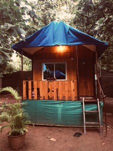 Akshay, who ran the AirBnB side of the business, arrived. He had this amazing relaxed and relaxing vibe about me. He led me through a humid area of forest which hosted the seven huts he proudly called his business. He had set me up at the furthest end. He marched up three steps to a small covered porch area and opened the door. Inside was a bed and a ceiling fan. There was a single light on the closest wall and a door at the far end. The door led out to a bathroom which was made of wicker and covered over in plastic sheeting. There was a toilet, sink and shower. Imagine a wet room built by Mad Max. I unpacked my bag and chilled out on the bed for a bit. I had a week ahead of me and I was glad I had just one room to call my own for that period. That was it. It was perfect.